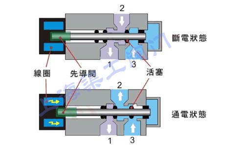 單電控二位三通電磁閥工作原理: 電磁閥激勵(電磁線圈流過電流,閥芯在電磁力的作用下移動,使閥芯壓縮彈簧,并移動到右側(cè),3和2口相通,1口封閉) 電磁閥失勵(電磁閥線圈沒有電流通過,因此,電磁閥的彈簧釋放,將閥芯移動到電磁閥的左側(cè),1和2口相通,3口封閉) |