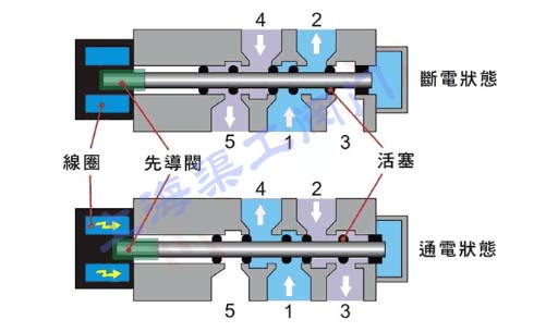 電磁閥失勵(電磁閥線圈沒有電流通過,因此,電磁閥的彈簧釋放,將閥芯移動到電磁閥的左側(cè),1和2口相通,4和5相通,氣源從1口進(jìn)入氣缸,5口排出氣缸里的氣體)
